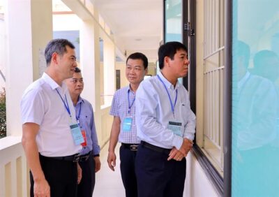 Cục trưởng Huỳnh Văn Chương (bên phải) kiểm tra công tác khảo sát tại trường THPT Nguyên Hồng, Bắc Giang